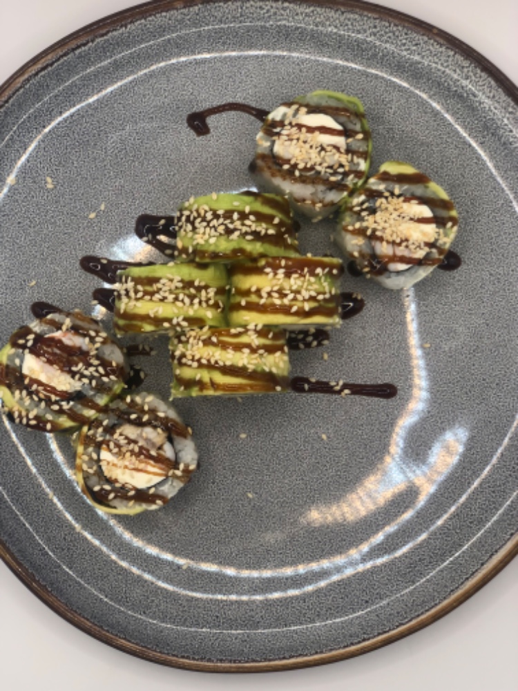 Каліфорнія з лососем в кунжутіЗапечений рол з мідіямиЗапечений рол з тигровою креветкою